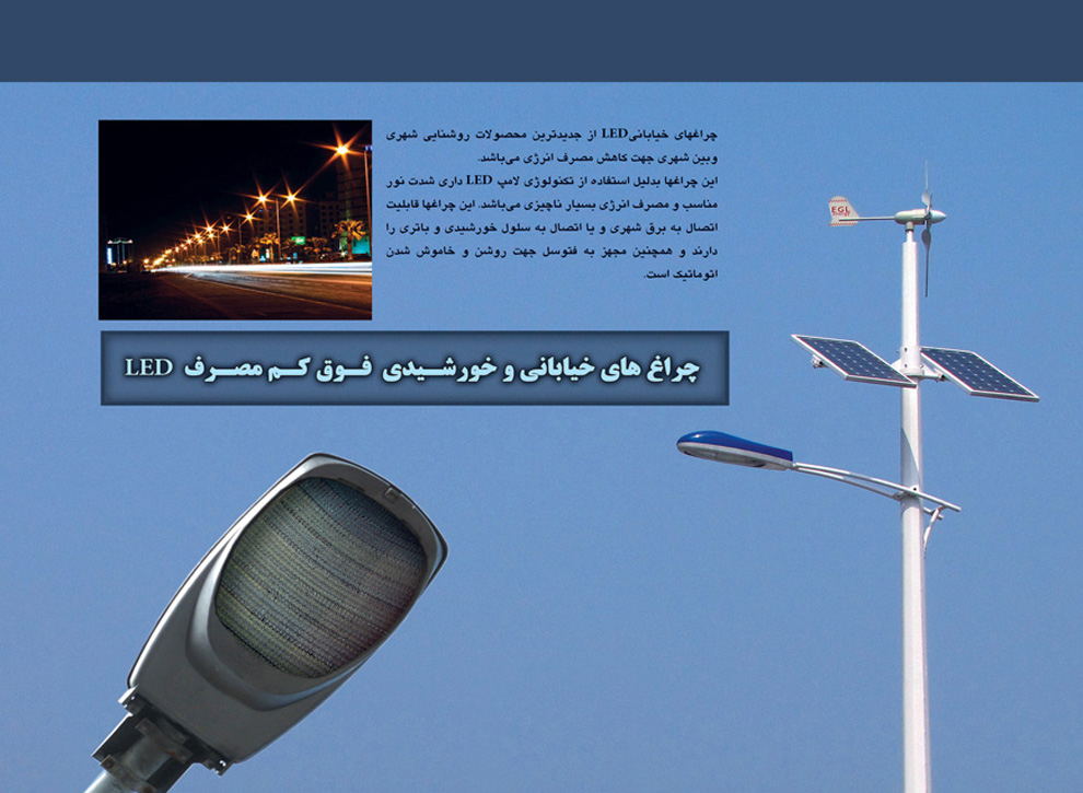 شرح : چراغ خیابانی LED تولید شده با جدیدترین تکنولوژی روز دنیا -Ù¾Ú© سری- مبتنی بر LED در ولتاژهای مختل٠220 Ùˆ 12 ولت Ùˆ دومنظوره ØŒ Ú©Ù‡ یک چراغ را میتوان هم با برق 220 ولت روسن نمود Ùˆ در زمان قطع برق نیز میتوان با برق 12 ولت بصورت اضطراری
